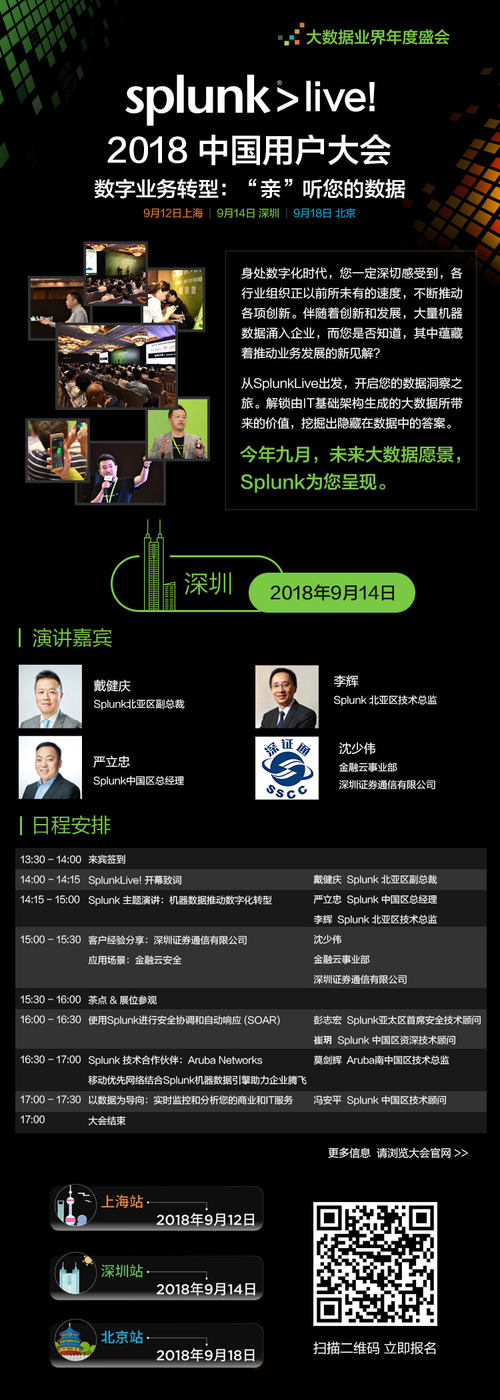在深圳站,Splunk北亚区副总裁戴健庆,Splunk中国区总经理严立忠,Splunk北亚区技术总监李辉、Splunk亚太区首席安全技术顾问彭志宏、Splunk中国区资深技术顾问崔玥、Splunk中国区技术顾问冯安平、深圳证券通信有限公司金融云事业部沈少伟等将亲临现场,与场内所有业界同仁共同探讨Splunk在企业数字化转型中的重要作用,如何利用机器数据获得业务增值及其在金融云场景下如何保证安全。
