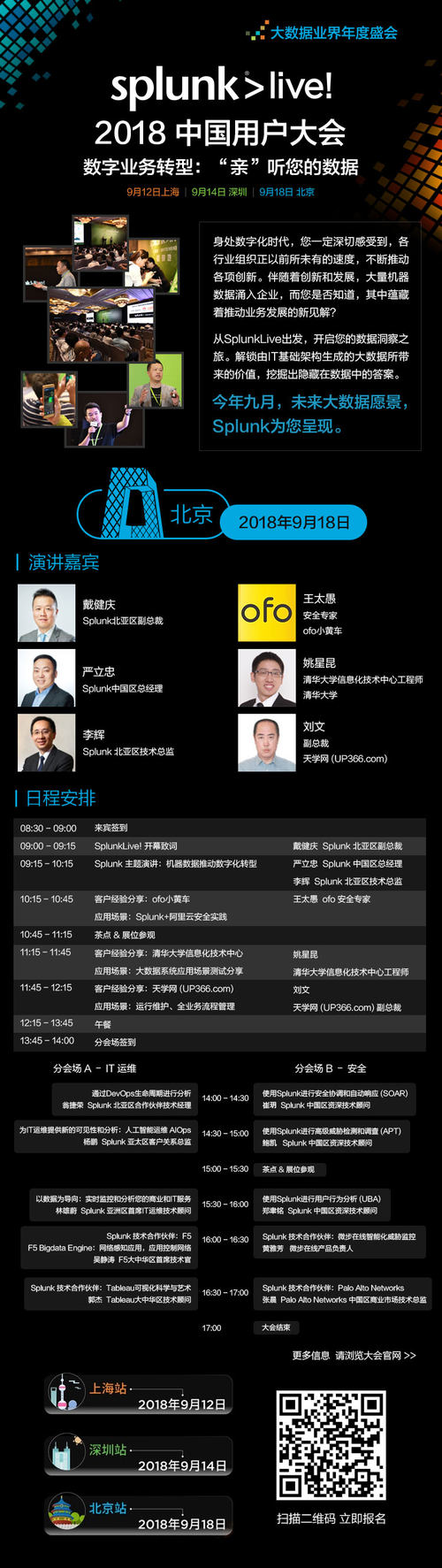 如果你想了解,Splunk>live!2018中国用户大会北京站便是不可错过的取经之地!北京站是本届Splunk>live!2018中国用户大会的收官之战,因此会场流程以及议题设置均更加严谨,以期真正让所有参会者有所收获。错过这一场,又要再等一年!嗨爆全天的精彩议程已为各位备好,请查收!