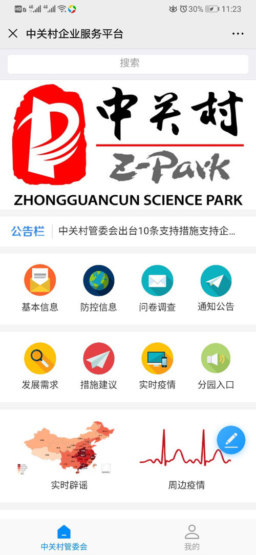 中关村企业服务平台,目前开设包括企业信息、防控信息、问卷调查、通知公告、发展需求、措施建议、实时疫情、分院入口在内的多个模块,企业可以根据自身需求,选择需要使用的模块,浏览信息或提出建议。