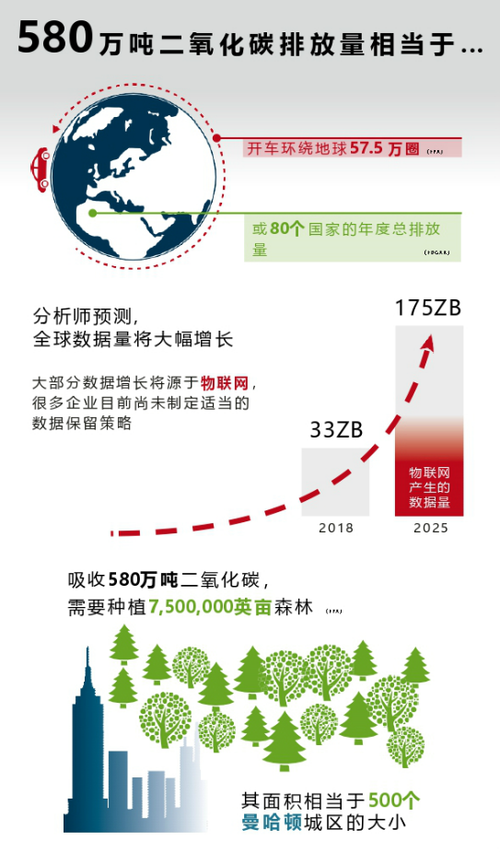 从世界范围出发,全球企业数据存储中,平均52%的企业数据未经分类和标记,成为难以治理的暗数据。此前,对暗数据的探讨更多聚焦于其对企业财务成本的消耗,而环境因素往往被人们忽视。IDC分析预计称,截止2025年,全球数据存储量将从2018 年的 33ZB 激增至175ZB,如不改变当下的数据治理策略,暗数据也将于五年间连翻四倍,增至 91ZB,而存储数据所需的能耗也将随之迎来四倍攀升。