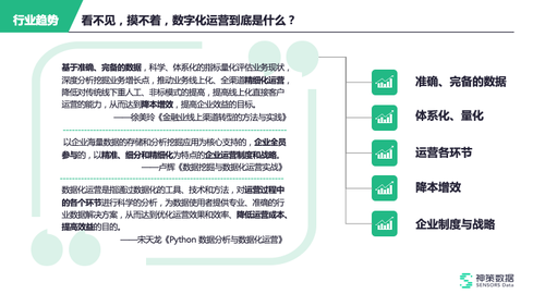 运营各环节。企业不仅要关注运营结果,分析业务结构,也要把数字化运营理念和方法应用到运营各环节。