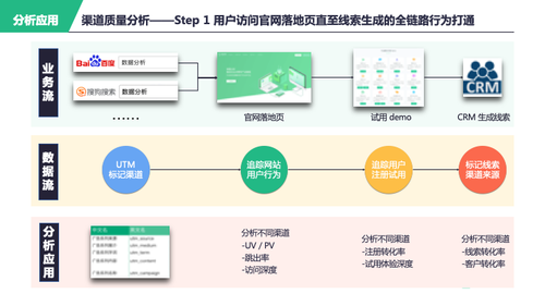 与业务流对应的数据流,第一步是在给用户搜索时投放的链接和关键词等会加上一定的渠道标记,以判断用户是来源于哪个渠道,哪个关键词,从而知道每个投放渠道和词的引流量。第二步,通过用户在官网落地页的行为追踪,如访问的功能模块、浏览内容等,从而可以分析跳出率、访问深度等。第三步,在注册 demo 试用环节,可以对注册试用的转化率、试用体验深度做追踪。第四步,在录入 CRM 线索时已经标记了线索渠道来源,再根据后续的追踪,分析不同渠道的线索转化率、客户转化率等。