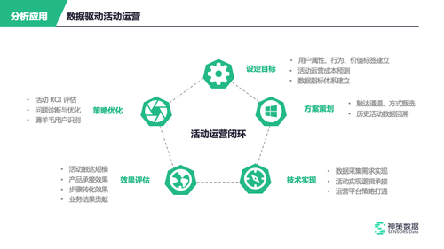 在活动运营的闭环里面,会经历以下阶段,分别是:设定目标——方案策划——技术实现——效果评估——策略优化,每个阶段都可以应用数字化运营。