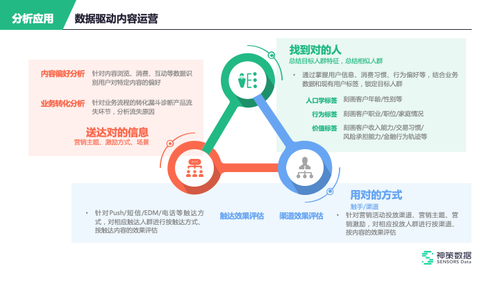 整体上,可以划分为两个方面:一方面为单纯的数据分析应用,通过数据分析诊断业务流程问题,评估业务效果、指导业务迭代,主要是指导业务方向,并不涉及与产品打通或更改产品流程;一方面为数据产品化应用,通过数据二次开发将数据应用至产品流中,提高个性化程度,如智能推荐算法。