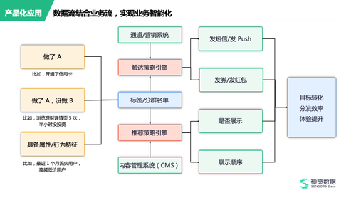 应用数据,即数据产品化,与业务流打通形成实时展示与触达策略。如下图,为数据产品化自动化运营系统的建设思路:策略制定→人群筛选→精准触达→效果回收。