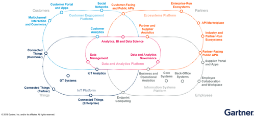 数据中台的建设方向应该处于企业数字化平台的核心,即Gartner定义的数据和分析平台(红色虚线部分),帮助企业的数字化平台(客户体验平台,生态系统平台,物联网平台和内部信息系统)的业务用户做出更好的决策,并在各个数字化平台的合作孵化下形成可复用的数据分析能力。数据分析能力应该在业务端无处不在且高度自助,最终助力数字化平台实现Gartner定义的封装的业务能力 (Packaged Business Capability)。