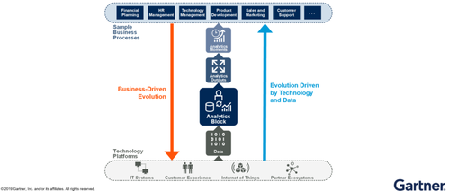 企业在渐进式数字化转型时面临的一个共同问题,他们各自为政,分别构建类似的解决方案,例如针对不同业务目的的数据分析模型,而这些模型具有共同的元素。在最好的情况下,这样做会造成重复,但更多的情况下,这也会增加复杂性,因为这样做会产生不同的点式解决方案,即使在单个业务内也无法沟通,更不用说在全公司的业务价值链上了。从这个角度来看,Gartner更推荐企业把数据中台定性成一个组织战略,把数据分析团队作为数字化平台建设必备的一个元素。Gartner也在2019年的《Gartner 数字化业务团队问卷》中发现,数据分析/商业智能是融合团队(Fusion team)中除IT以外最常见的功能。