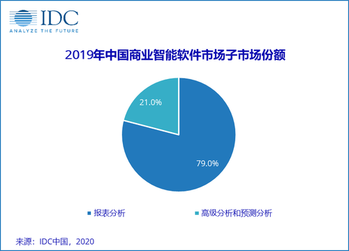 AI与BI的融合被认为是未来BI的发展方向,不少国内BI厂商都在BI软件中引入了AI功能,面向未来布局。但是也有一些人认为国内BI领域AI的应用还有一段距离,数据基础的积累、算法模型与业务的结合还有待加强。从IDC的报告中可以看到在国内BI市场,目前最主要的需求是报表分析软件,2019年全年年市场份额占比为79.0%。高级分析和预测分析市场份额占比21.0%。