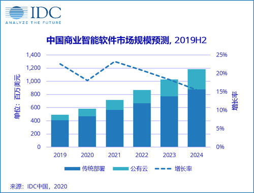 日前IDC发布了《2019年下半年中国商业智能软件市场数据跟踪报告》,报告显示,2019年全年中国商业智能软件市场规模为4.9亿美元,同比增长22.6%。受疫情影响,IDC预测2020年中国商业智能软件市场增速有所放缓,同比增长18.1%。到2024年,中国商业智能软件市场规模将达到11.9亿美元,未来5年整体市场年复合增长率(CAGR)为19.2%。