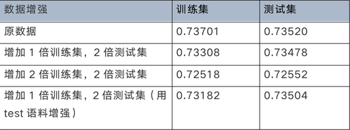 数据增强我们尝试了两种方式,第一种是同义词替换、随机插入、随机交换、随机删除结合的方式,代码参考了方法[1];第二种是回译法,即将训练集中的文本数据通过百度翻译API翻译成英文和日文后,再翻译成中文,得到新数据集后对原有训练集做数据扩充。在数据探索的实验中,我们将原训练集划分成了训练集、测试集和验证集,下表是数据增强的实验结果,发现效果并不理想。