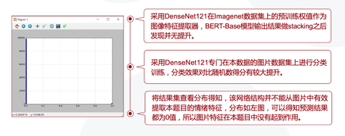 我们尝试采用DenseNet121在ImageNet数据集上的预训练权值作为图像特征提取器,BERT-Base模型输出结果做stacking之后发现并无提升。另外,我们采用DenseNet121在本数据的图片数据集上进行分类训练,分类效果对比随机得分有较大提升,但是将结果集查看分布得知,该网络结构并不能从图片中有效提取本赛题的特征,预测结果分布如下图5,可知预测都为0值,说明图片特征在本赛题中无明显效果。