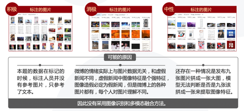 首先是数据分析,我们发现比赛数据的特点是微博口语化严重、存在表情符、配图随意性强,而且存在分类标准模糊、图片和文本数据混合等众多挑战,具体见下图2。