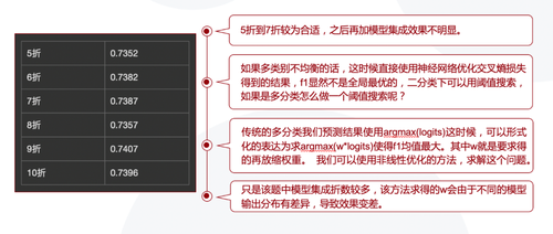 我们采用了F1值适应优化以及多折模型融合的技术,这两个技术都有明显的效果提升。F1值适应技术的主要思想是准确度最高的模型,它的F1值并非最大,所以我们在输出结果的时候,前面乘一个权重,然后通过非线性优化的方法使得F1值最大。在模型融合方面,经过实验,5到7折能够取得最好的效果。