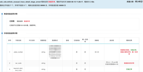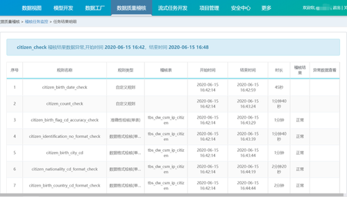 通过BD-OS的数据质量稽核功能,我们针对关键表配置了数据质量稽核任务,通过稽核任务监控,我们可以清晰的看到每个稽核规则执行的结果。