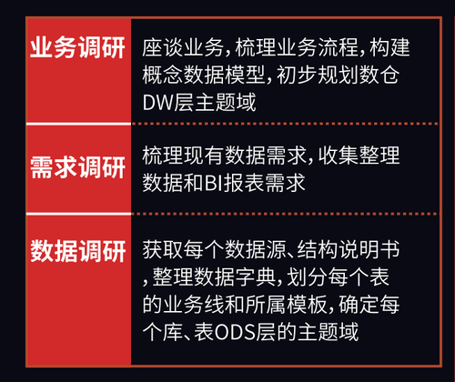 所以在需求讨论的基础上,需要理解业务工作流程,当然如果你已经具备了这个行业丰富的业务知识,那可以在需求调研的时候尽可能地让对方按照自己的思路去完成数据仓库系统的功能设计。