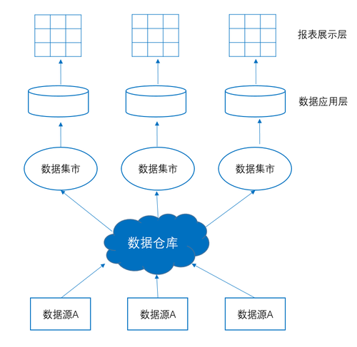 数据仓库在逻辑上可以分成操作型数据库、数据仓库层、数据集市层、数据分析应用层和报表展示层,其架构如下图所示: