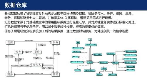 在中国移动,信息子层逻辑模型的设计采用自顶向下方法,通过分析数据封装和业务规范的需求,形成基础数据视图(如KPI、报表)、个人客户、集团客户、家庭客户、他网客户、产品、渠道、终端、校园客户、垃圾短信客户、网络和营销资源统一视图。这形成了企业数据模型的基础,是数据仓库的一个核心,后续所做的数据挖掘等很大程度上来源于该模型本身的数据质量和数据唯一性、全局性。