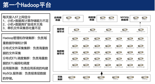 2014年底海南移动搭建了12台的Hadoop节点,集群较简单,2015年海南移动每天接入5T上网信令,彼时传统架构的弊端更为明显,小机+数据库计算存储能力不足,扩容成本太高,单机文件采集吞吐量不足。为了解决以上弊端,海南移动构建了Hadoop管理和存储集群,包括分布式文件采集集群、分布式ETL调度集群、应用服务器、MySQL服务器,第一个Hadoop平台就此成型。