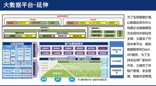 企业级大数据平台实现结构化、半结构化和非结构化数据统一存储计算功能,通过数据封装提供服务功能,提供自助报表工具,面向市场、网络以及企业外部提供服务。