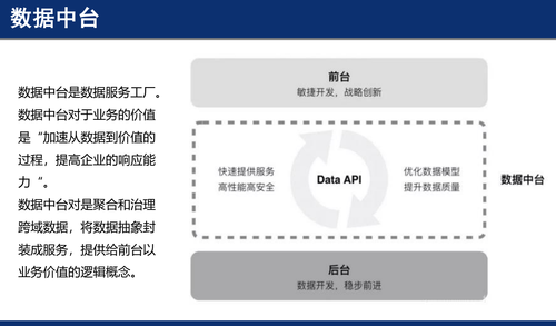 王保强认为数据中台是数据服务工厂,对于业务的价值是“加速数据到价值的过程,提高企业的响应能力。”是聚合和治理跨域数据,将数据封装成服务,提供给前台业务价值的一个逻辑概念。从这个角度上,与大数据平台的发展一脉相承。