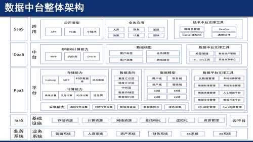 4、数据中台是指通过数据技术,对海量数据进行采集、计算、存储、加工,同时统一标准和口径。数据中台把数据统一之后,会形成标准数据,再进行存储,形成大数据资产层,进而为客户提供高效服务。