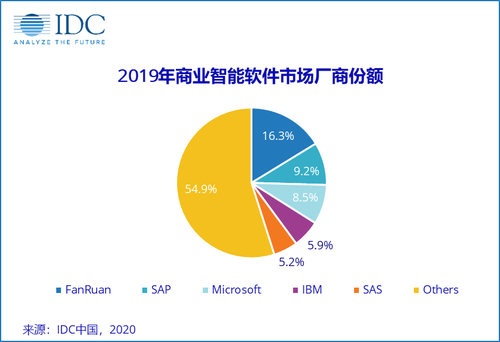2018年,帆软以14.88%的市场占有率业内知名,延续了2017年的市场地位。2019年,帆软以16.3%的市占率继续领跑,并连续3年业内知名。
